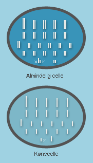 Mennesket har 46 kromosomer, der udgør 23 par. Æg- og sædcellerne indeholder imidlertid kun et halvt sæt kromosomer - det vil sige 23 i alt. Når en æg- og sædcelle smelter sammen kombineres kvindens og mandens 23 kromosomer i en ny celle, der kan udvikle sig til et nyt liv.